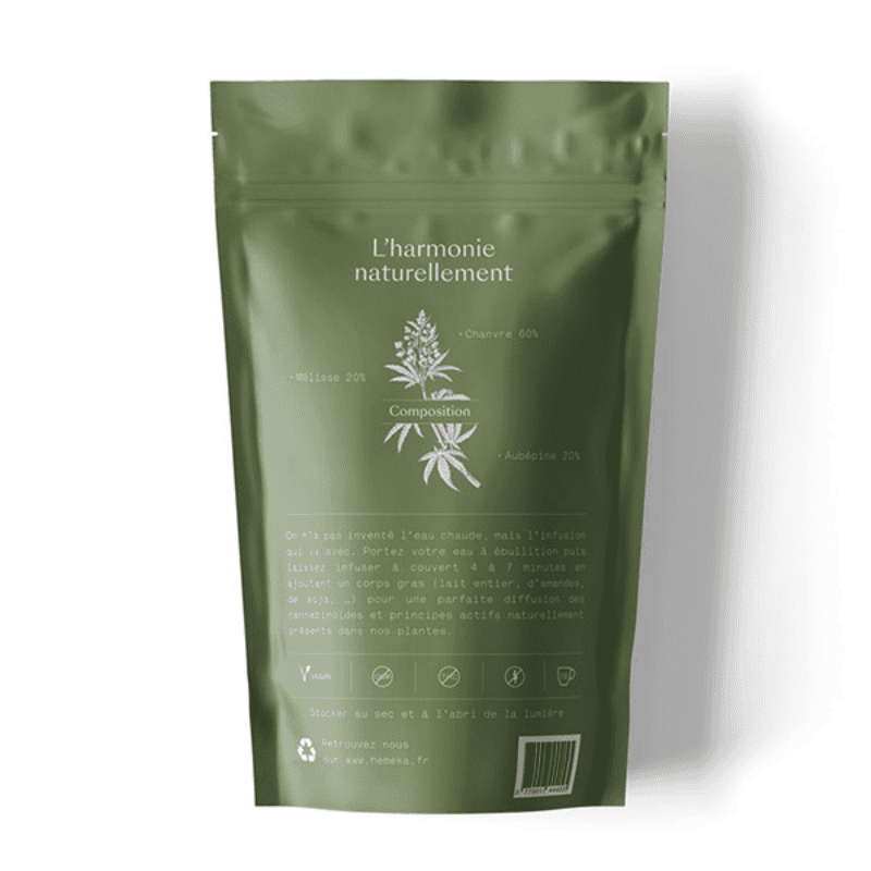Imagine enjoying a cup of hemp infusion: Hemeka Relaxing after a stressful day or just before going to bed. Lemon balm and hawthorn work in synergy to give you a real moment of well-being. The soothing, relaxing effects of this infusion will help you to unwind gently, leave the stress of the day behind and rediscover serenity.