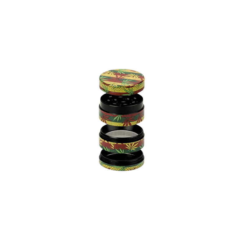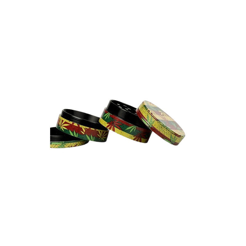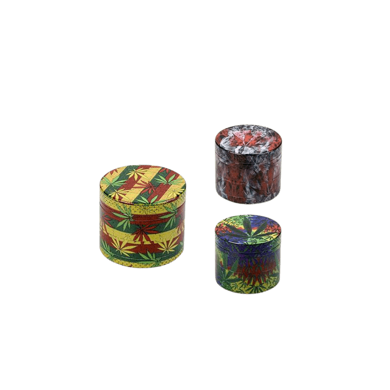 Colorful grinders featuring plant leaves are the perfect accessory for smokers who want to grind their tobacco in style. Made from sturdy metal, they feature diamond-shaped teeth for fine grinding and a sieve to catch particles. The magnetic lid ensures a secure closure for added safety. The colors are random for a varied and personalized choice. The grinder's dimensions are 40mm in diameter and 33mm in height, making it easy to store and transport.