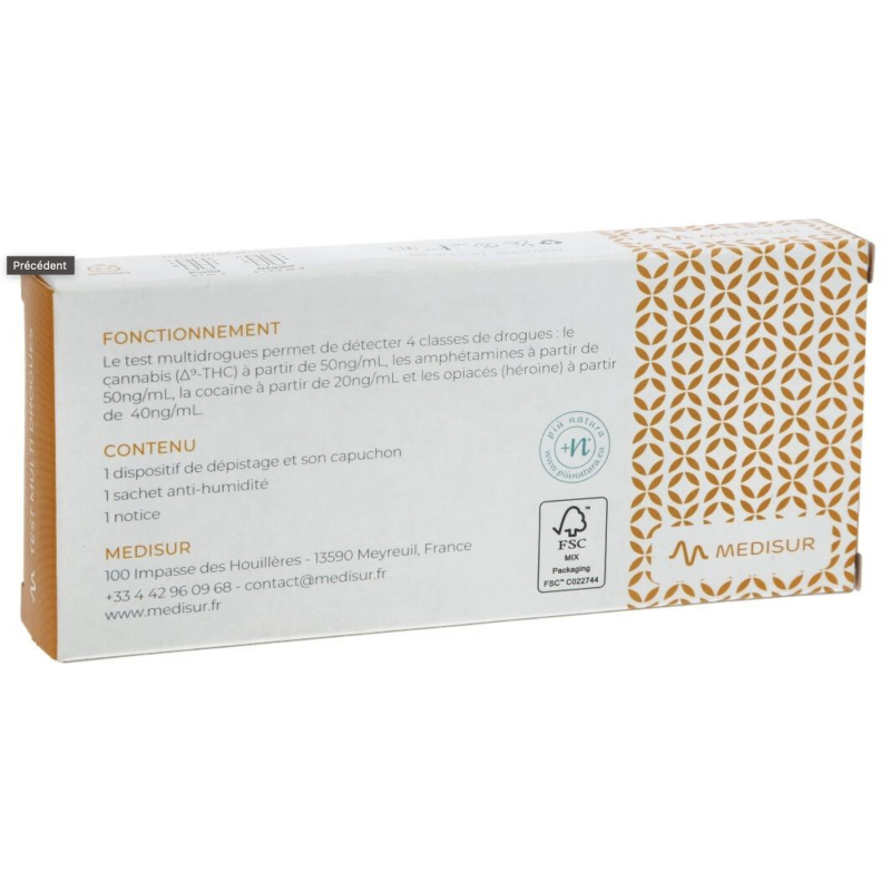 Découvrez le test salivaire Multi Drogues de Medisur, un outil révolutionnaire offrant une détection simple et rapide de quatre types de drogues majeures (cannabis, opiacés, amphétamines et cocaïne) en seulement quelques minutes. Ce test permet l'autoévaluation de la consommation de drogues ainsi que la sensibilisation et la prévention au sein de l'entourage, contribuant ainsi à promouvoir la sécurité routière et la prise de conscience des risques associés à la consommation de drogues.